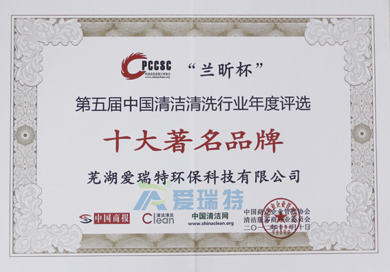 金秋颯爽,碩果累累,由中國商報、中國清潔網(wǎng)、中國商業(yè)企業(yè)管理協(xié)會、清潔服務商專業(yè)委員會舉行的“蘭昕懷”第五屆中國清潔清洗行業(yè)年度評選活動中,蕪湖愛瑞特環(huán)保科技有限公司被評為“十大著名品.