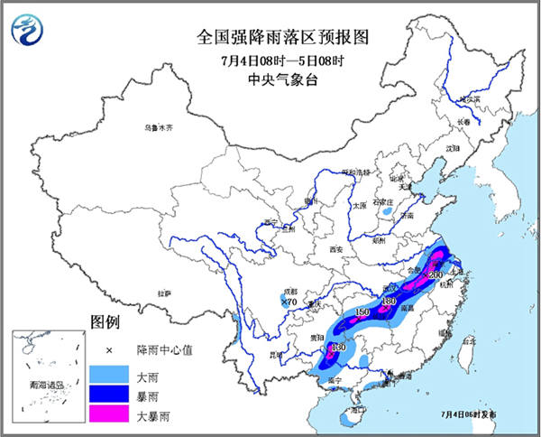 7月4日,我國南方地區持續強降水天氣短暫停歇,抗洪搶險工作迎來“黃金大半天”。但是搶險前景仍不容樂觀。據中央氣象臺消息,預計4日08時至5日08時,安徽中南部、江蘇中南部、湖北東南部、江西西北部、湖南中部和東北部、貴州東南部、廣西西北部和南部沿海等地有暴雨,其中,安徽和江蘇兩省沿江地區、湖南東北部及中部、廣西西北部等地的部分地區有大暴雨(100~200毫米);上述地區伴有短時強降水和雷暴大風等強對流天氣,最大小時雨強60~80毫米。南方大部地區仍然處于暴雨紅色預警中。